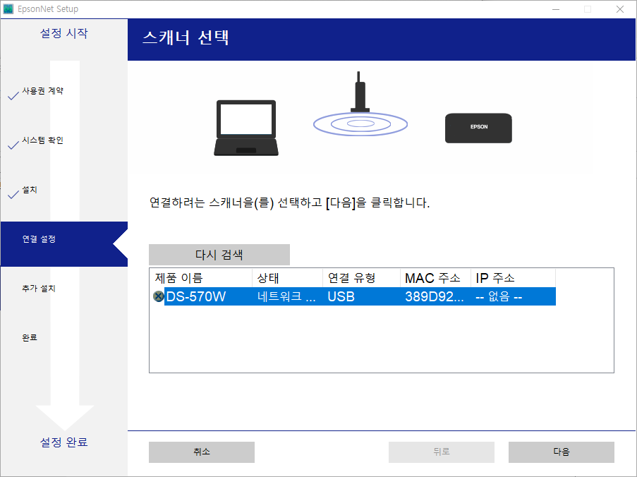 USB로 연결한 스캐너가 목록에 나타납니다. 선택 후 다음.