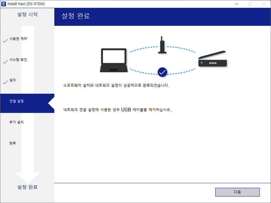 제품 구매시 제공받은 USB 케이블을 스캐너 뒷면과 본체에 연결하고 다음을 클릭합니다. (스캐너 뒤에 보시면 특이한 포트가 하나 있는데, 이곳에 맞는 케이블이 박스에 동봉되어 있습니다.)