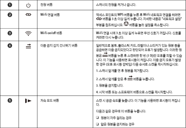스캐너에 보시면 이런 버튼들이 있으실텐데요. 스캐너의 전원을 켠 후 와이파이 버튼을 통해 와이파이 기능을 켜주세요. 이 글 맨 아래쪽에 버튼에 대한 설명 추가해 두었습니다.