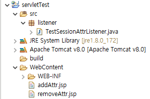 TestSessionAttrListener-HttpSessionAttributeListener구현 클래스addAttr.jsp- 세션에 attribute를 추가 또는 변경하는 JSPremoveAttr.jsp- 세션에 attribute를 제거하는 JSP