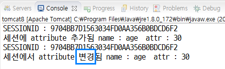 이벤트별 호출 메서드에 세션 ID와 변경된 attribute의 name과 value를 콘솔에 출력되도록 하였습니다.