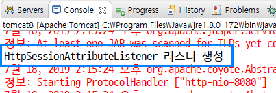 예제 작성이 모두 끝났으면 톰캣 서버를 시작합니다. 서버를 시작하는 과정에서 console에 리스너가 생성되었다는 로그를 볼 수 있습니다.