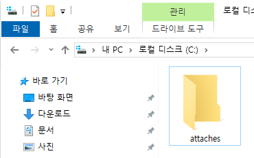 저의 경우에는 알기 쉽게 C 드라이브 하위에 C:\attaches 경로로 폴더를 생성해 두었습니다. 실제 Product 환경에서 구동되는 서버라면 보안정책에 따라서 접근을 제어할 수 있는 디렉터리로 설정하시기 바라비다.