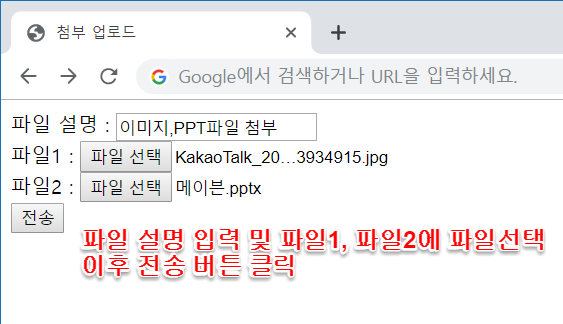 파일1과 파일2에 파일선택 버튼을 눌러 파일을 첨부하고 전송버튼을 눌러 업로드합니다. 이미지 파일과 ppt 파일을 하나 첨부하였습니다.