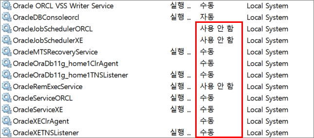 서비스들을 수동으로 시작하도록 변경했습니다. 이후에 시스템을 재부팅 하는 경우 Oracle이 스스로 시작되지 않습니다. (자동으로 한 경우에는 자동으로 시작됩니다)