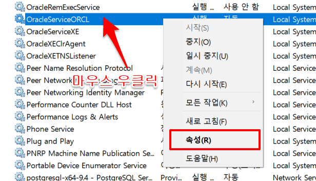 서비스를 마우스 우클릭하고 속성을 클릭합니다.