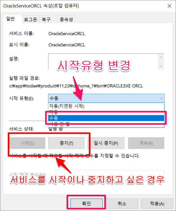 Oracle 서비스 시작유형 자동/수동 으로 변경