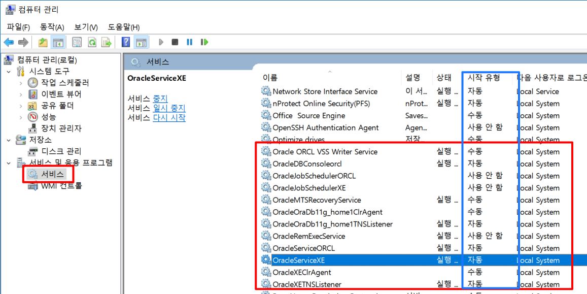 기본적으로 Oracle을 설치하면 서비스의 시작유형이 자동으로 설정됩니다. 이를 수동으로 변경해 보겠습니다. 자신이 설치한 Oracle이 Express Edition인 경우 OracleServiceXE와 OracleXTNSListener를 아래와 같은 방법으로 설정하면 됩니다.