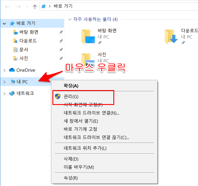 시작버튼 + E를 눌러 윈도우 탐색기를 실행합니다.- 내 PC를 마우스 우클릭 후 관리를 클릭합니다.