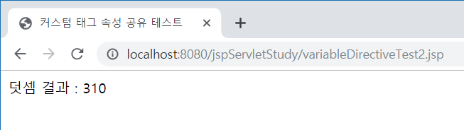 커스텀태그를 호출할 variableDirectiveTest2.jsp 파일의 내용은 다음과 같습니다. attrName 값을 "mySumResult"으로 지정하였기 때문에 태그 호출후 EL에서 ${mySumResult}로 변수를 공유합니다.
