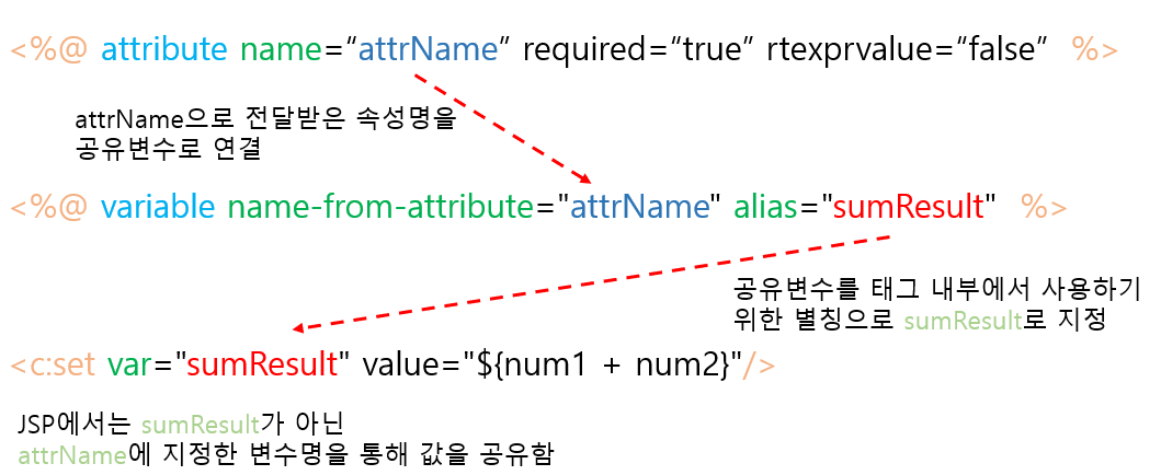 attribute 디렉티브를 통해 태그의 속성을 추가로 하나 더 받습니다. 이 속성을 통해 공유변수명을 지정할것입니다. rtexprvalue를 false로 한 이유는 JSP에서 해당 속성 사용시 스크립트 요소나 EL등을 통해 지정하지 못하게 해야하기 때문입니다.