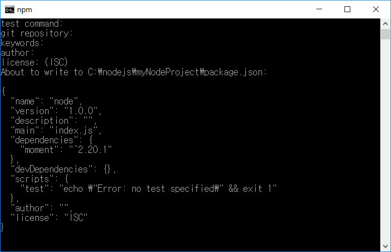 package.json파일을 열어보면 아까 init 명령어를 실행한 이후 입력했던 정보들이 json 형태로 입력되어 있음을 알 수 있습니다. 여기서 중요한 것은 dependencies 부분입니다. 이 부분을 보면 프로젝트에서 설치한 외부 모듈인 moment가 들어가 있습니다.